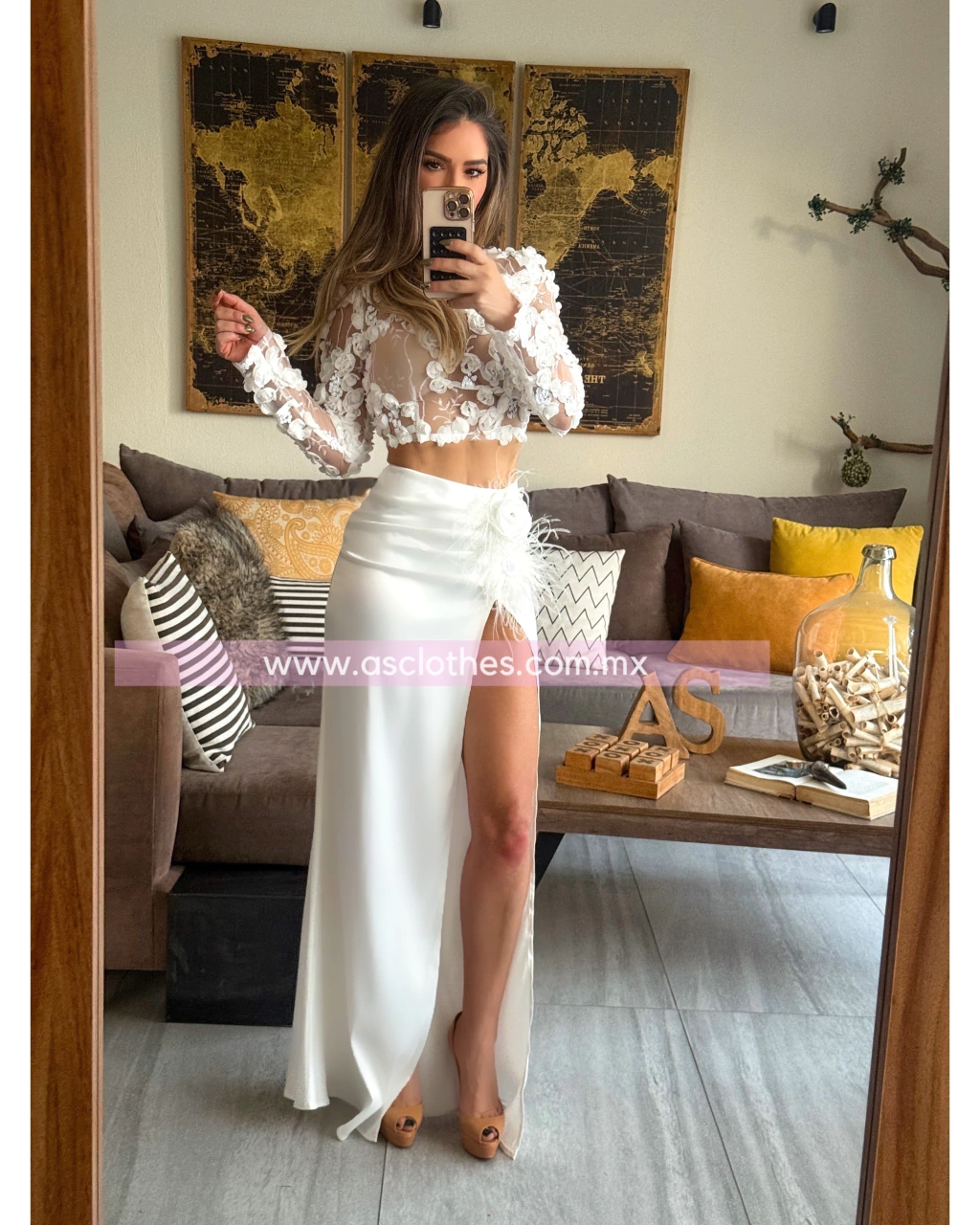 • FALDA DETALLADA CON RIBETE DE PLUMAS DE AVESTRUZ + ROSA